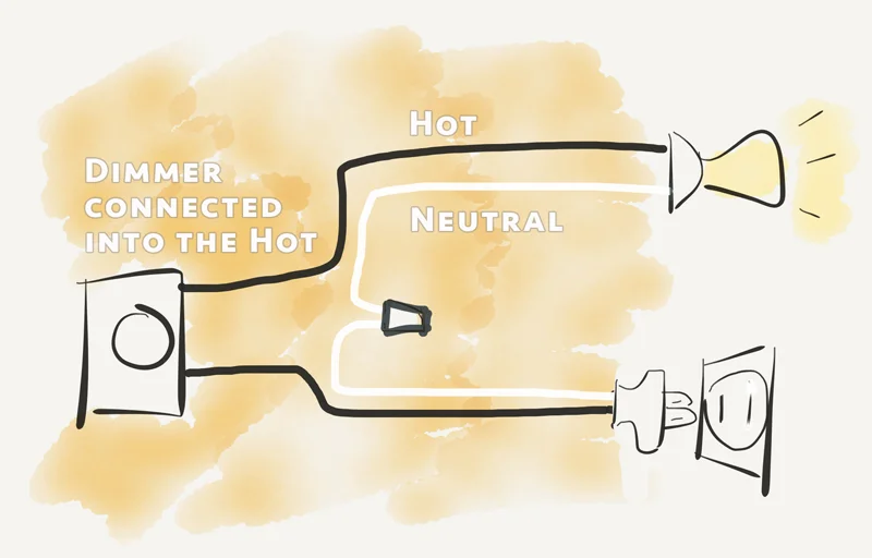 A simply wire diagram showing how a switch or this case a dimmer, is wired into the "Hot" link (black wire) vs the neutral (white wire) in a basic electrical circuit.