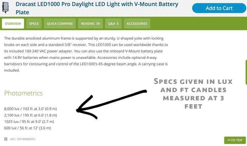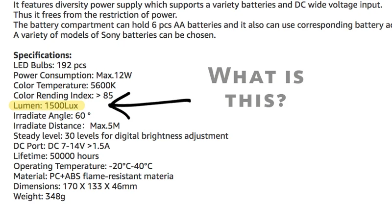 So, when you’re on non-industry sites, like Amazon, even when looking at film lights, note that the specs you get there are posted by the seller and may only list lumens or worse, list a lumen and lux rating together with no distance. I’ve seen a spec listing lumens: 600 lux/meter. What the hell does that mean?